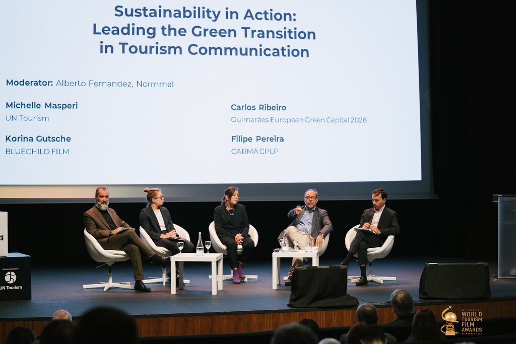 Após a sessão de abertura decorreu o primeiro painel do dia, dedicado ao tema "Sustentabilidade em Ação: Liderar a Transição Verde na Comunicação Turística", que reuniu Michelle Masperi (UN Tourism), Carlos Ribeiro (Guimarães – European Green Capital 2026), Korina Gutsche (BLUECHILDFILM), Filipe Pereira (CARMA CPLP) e Alberto Fernandez (Normmal). O debate reforçou a importância da sustentabilidade como pilar central do futuro da comunicação turística e destacou a crescente responsabilidade dos destinos e dos conteúdos audiovisuais na promoção de práticas mais conscientes e alinhadas com a transição ecológica.