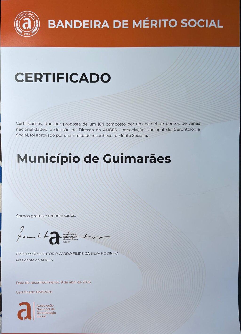O Município de Guimarães foi distinguido com a menção honrosa da Bandeira de Mérito Social 2026, atribuída pela Associação Nacional de Gerontologia Social, no passado dia 9 de abril. A distinção teve por base o Programa Guimarães 65+, uma iniciativa municipal que coloca no centro da ação os idosos em situação de maior vulnerabilidade, isolamento e solidão.