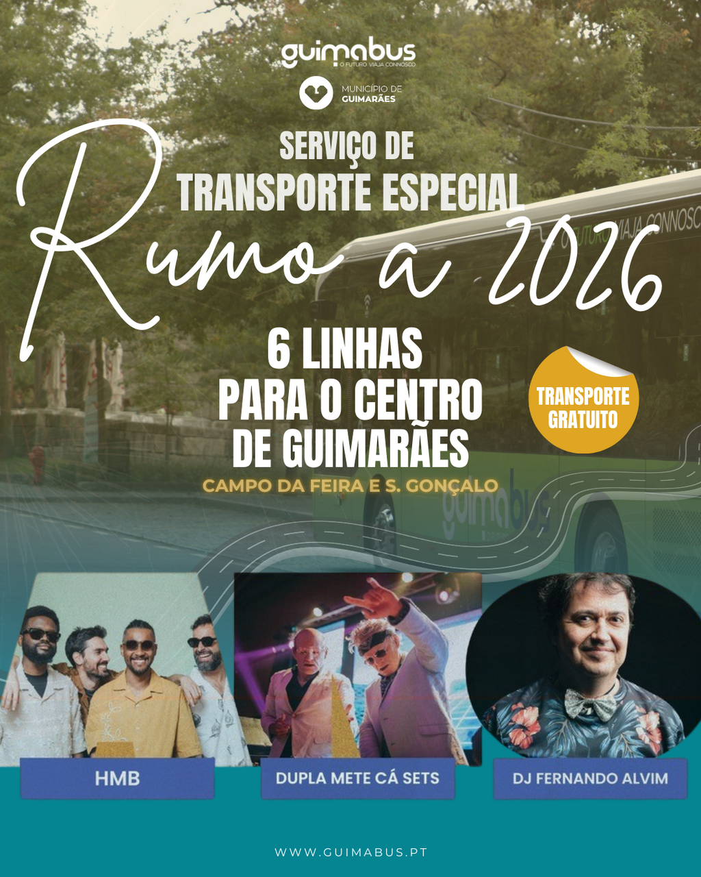O serviço especial e gratuito de transporte em autocarro será assegurado pela GUIMABUS, com horários e percursos adaptados à noite festiva. Estarão disponíveis seis linhas, em funcionamento entre as 21h00 do dia 31 de dezembro e as 03h00 do dia 1 de janeiro: