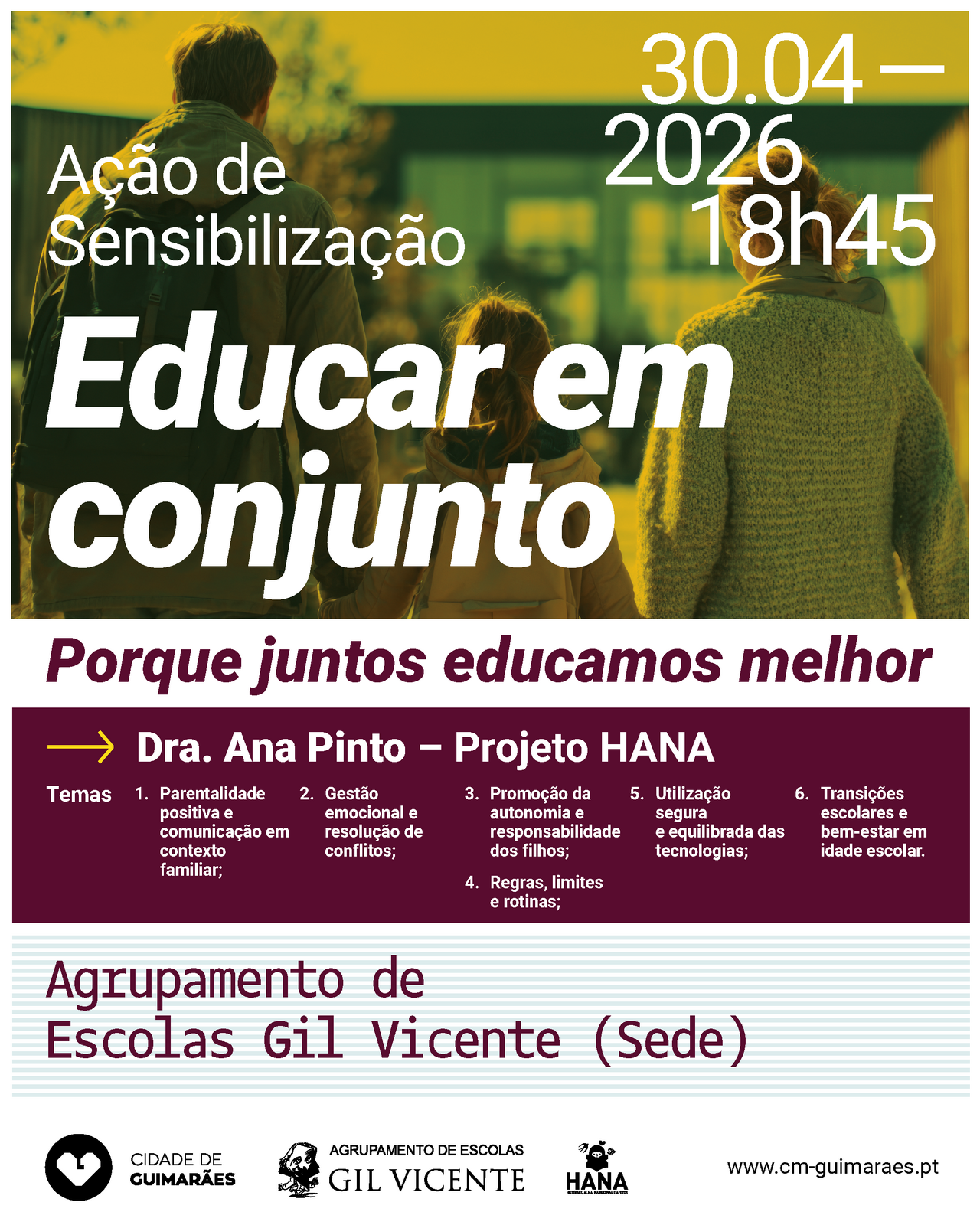 Dinamizada pela Dra. Ana Pinto, no âmbito do Projeto HANA, a iniciativa dirige-se a Pais e Encarregados de Educação dos 2.º e 3.º ciclos, convidando-os a integrar um espaço de partilha e reflexão. Ao longo da sessão, serão abordadas temáticas como a parentalidade positiva e a comunicação em contexto familiar, a gestão emocional e resolução de conflitos, a promoção da autonomia e responsabilidade, a definição de regras e rotinas, a utilização equilibrada das tecnologias e o bem-estar em contexto escolar.